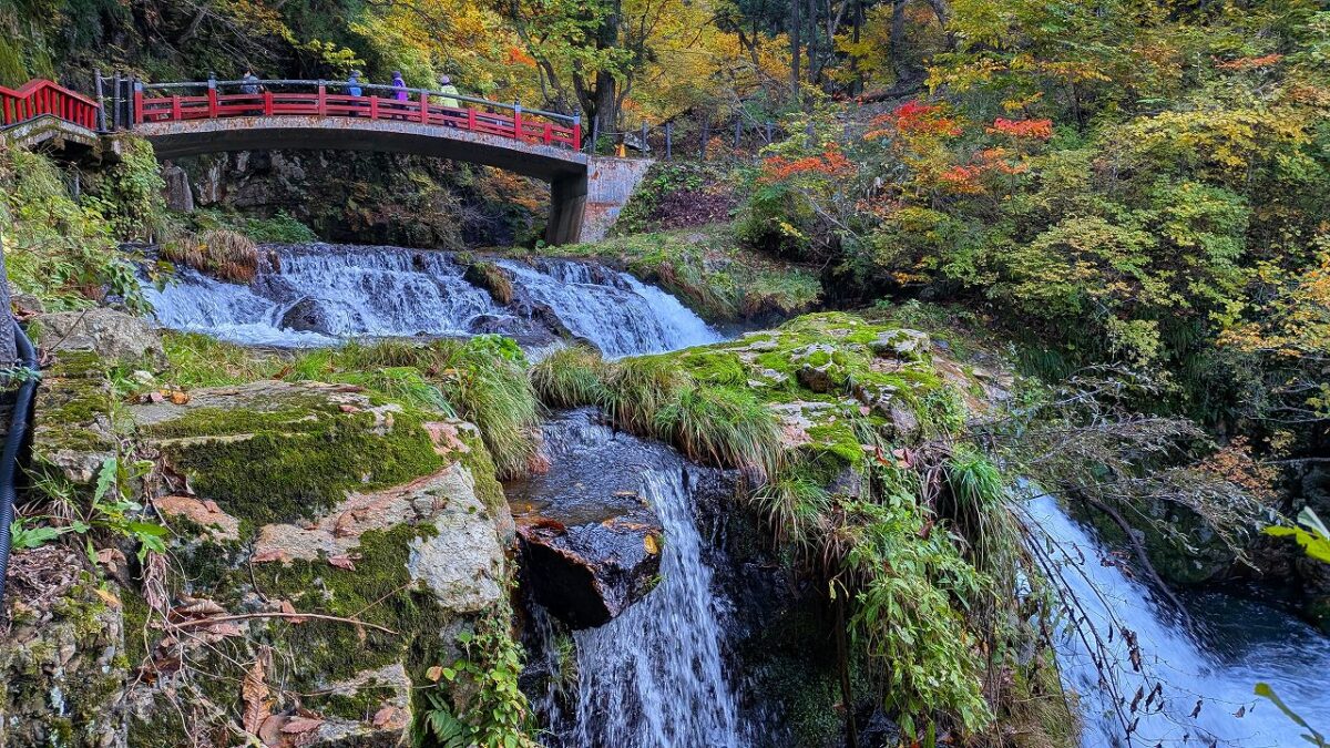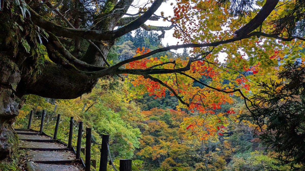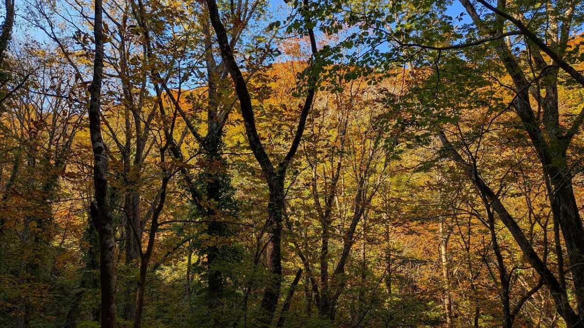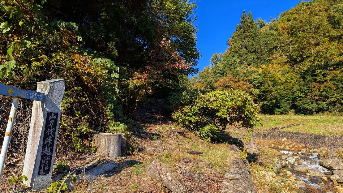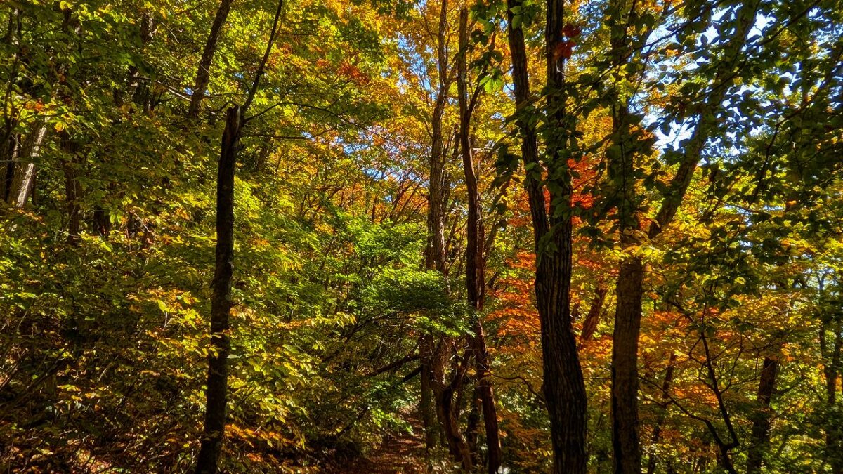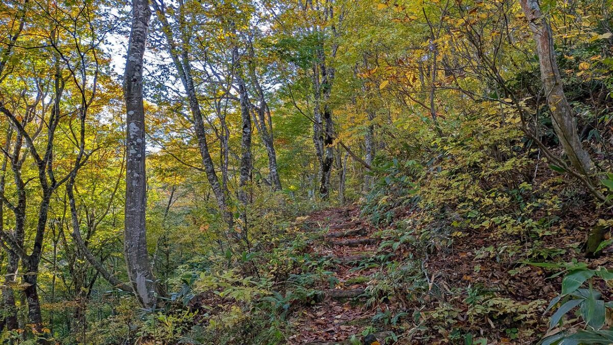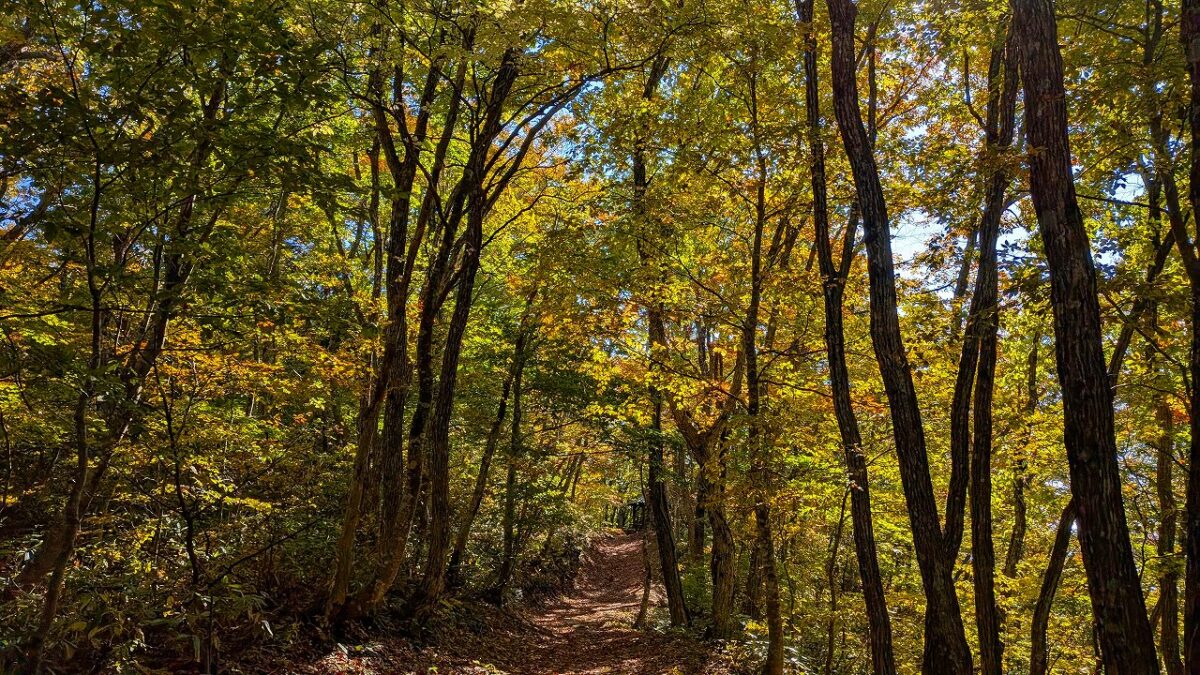 そこからタクシーで山刀伐(なたぎり)峠登山口から紅葉が映える峠みち