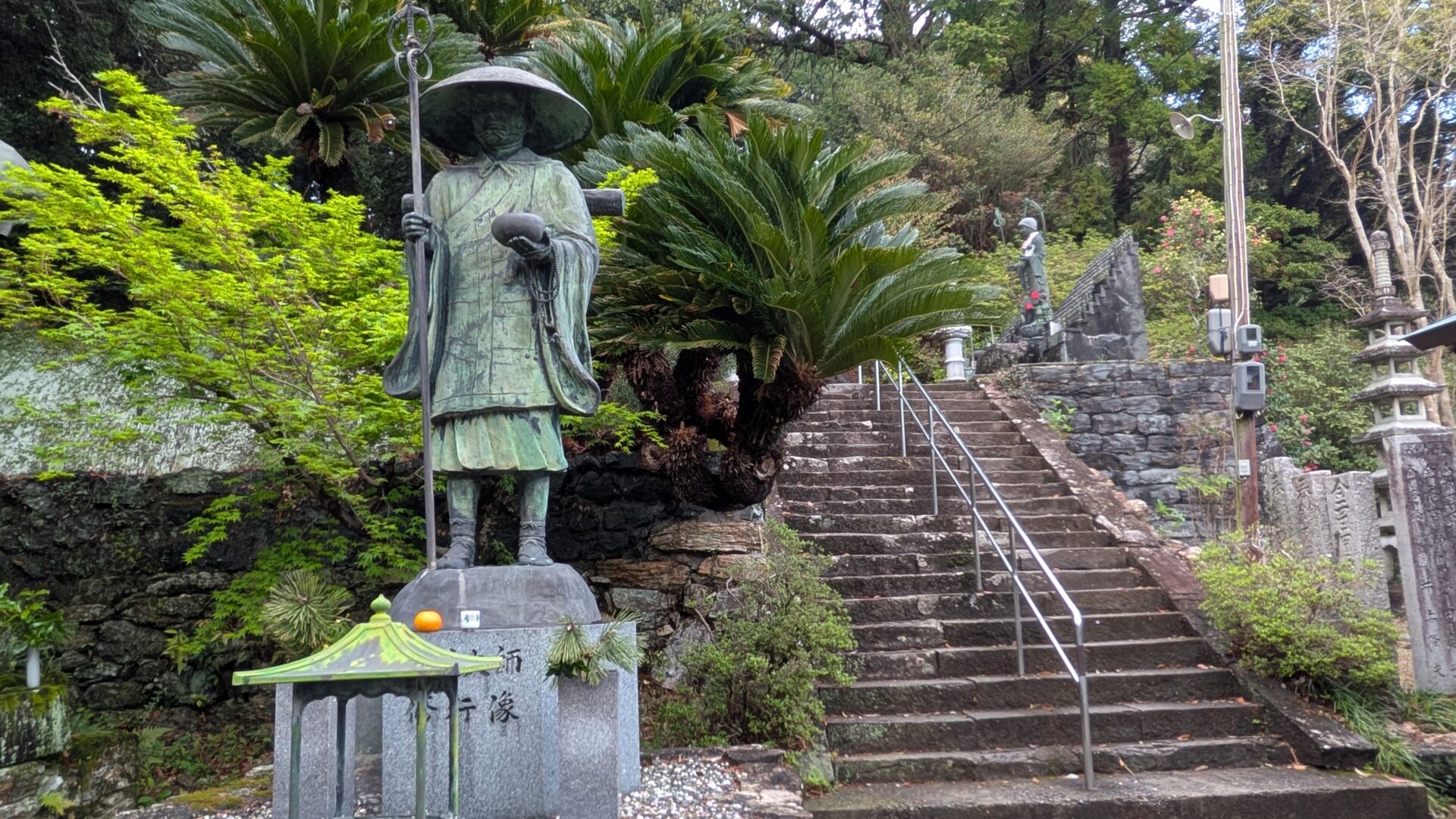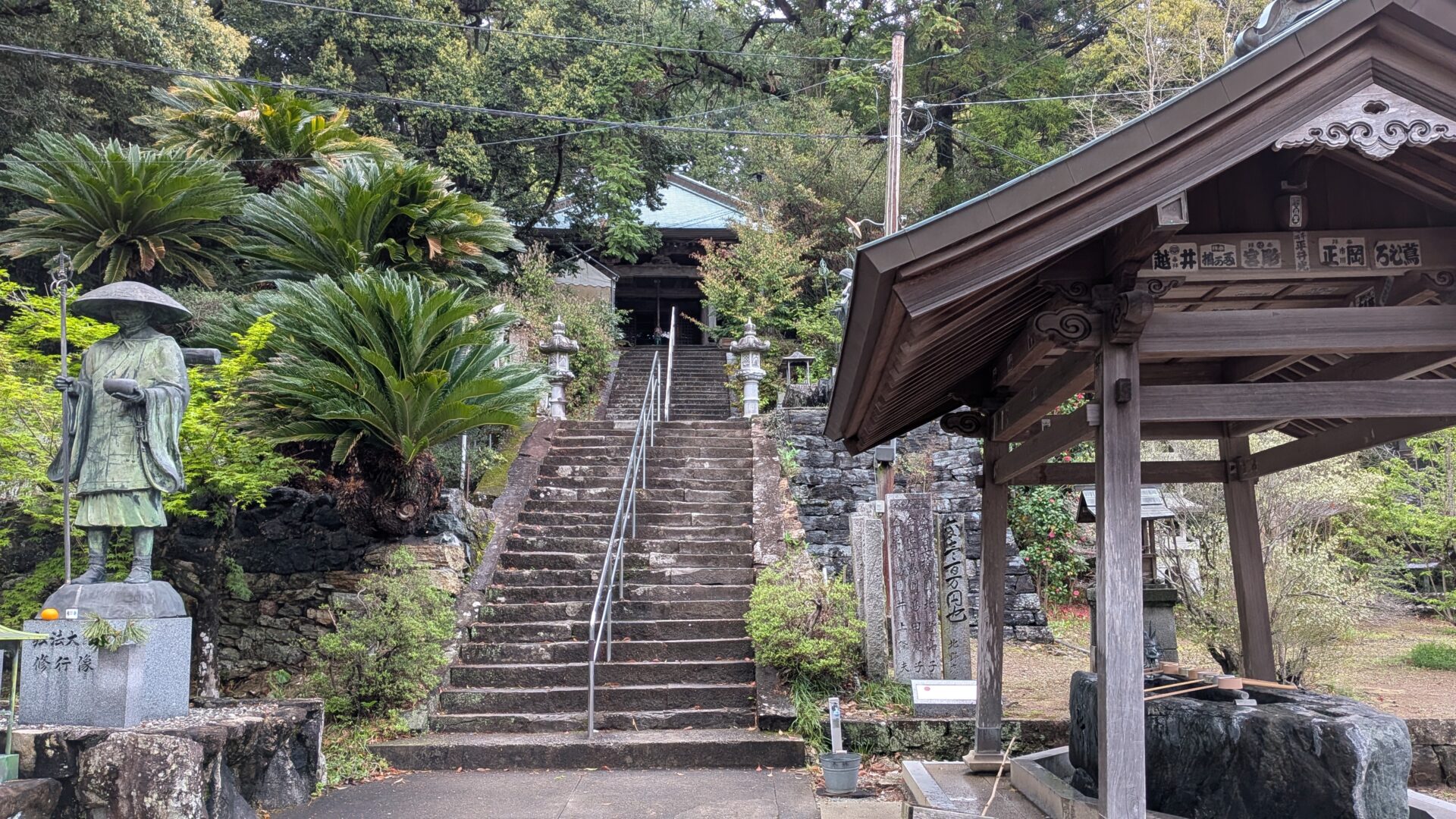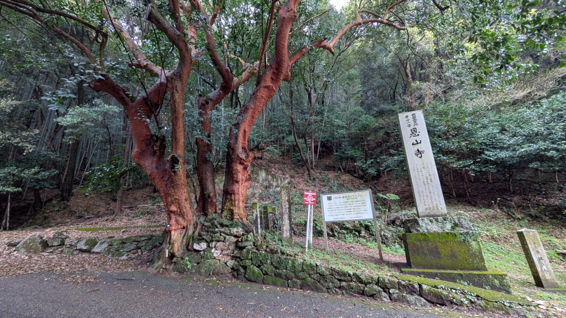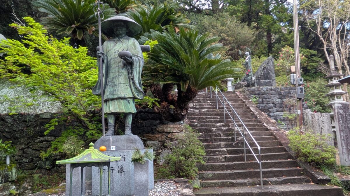 2026.14日目/後半は18番恩山寺〜 阿波・徳島県 1~23札所 2026.04.10 2026/04.10 (金) 雨 徳島阿波おどり空港から徳島駅経由、南小松島駅へ移動。バスの発車時間まで南小松島を散策18番恩山寺、朽ち果てた仁王門川の橋を渡り、その先には天然記念物恩山寺ビランジュへんろ山道を登り、本堂、そして大師堂のそばに、「大師御母公剃髪所」の石碑今日は、恩山寺近くの民宿ちばに宿泊 18番恩山寺 18番恩山寺ビランジュ 小松島市たぬき広場